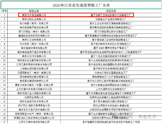 近日,江苏省工业和信息化厅公示了2025年江苏省先进级智能工厂,南京汽车锻造有限公司名列榜首。