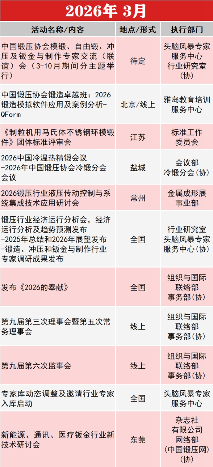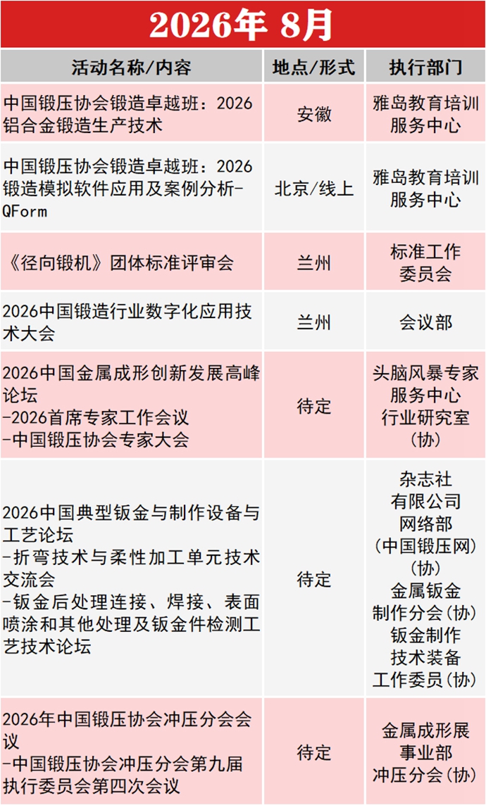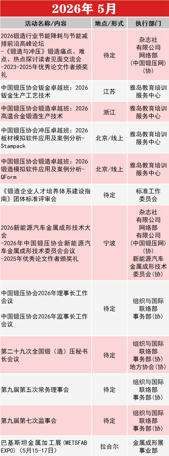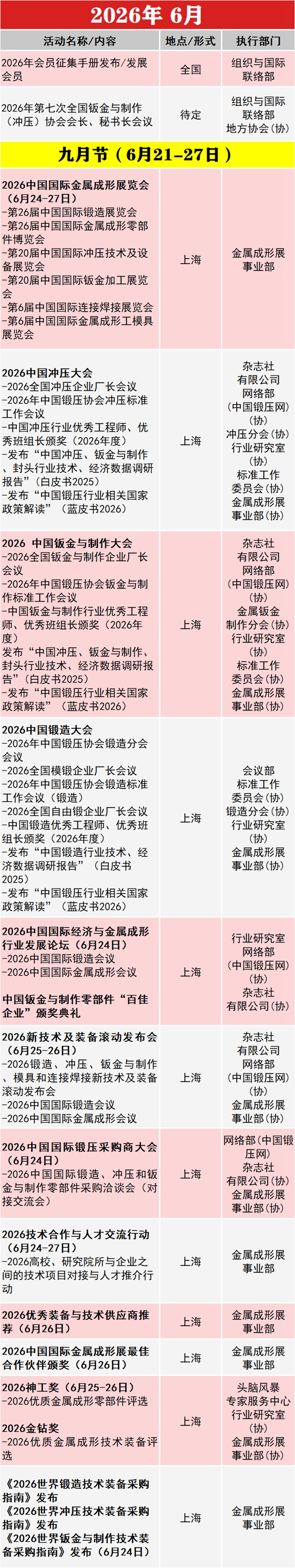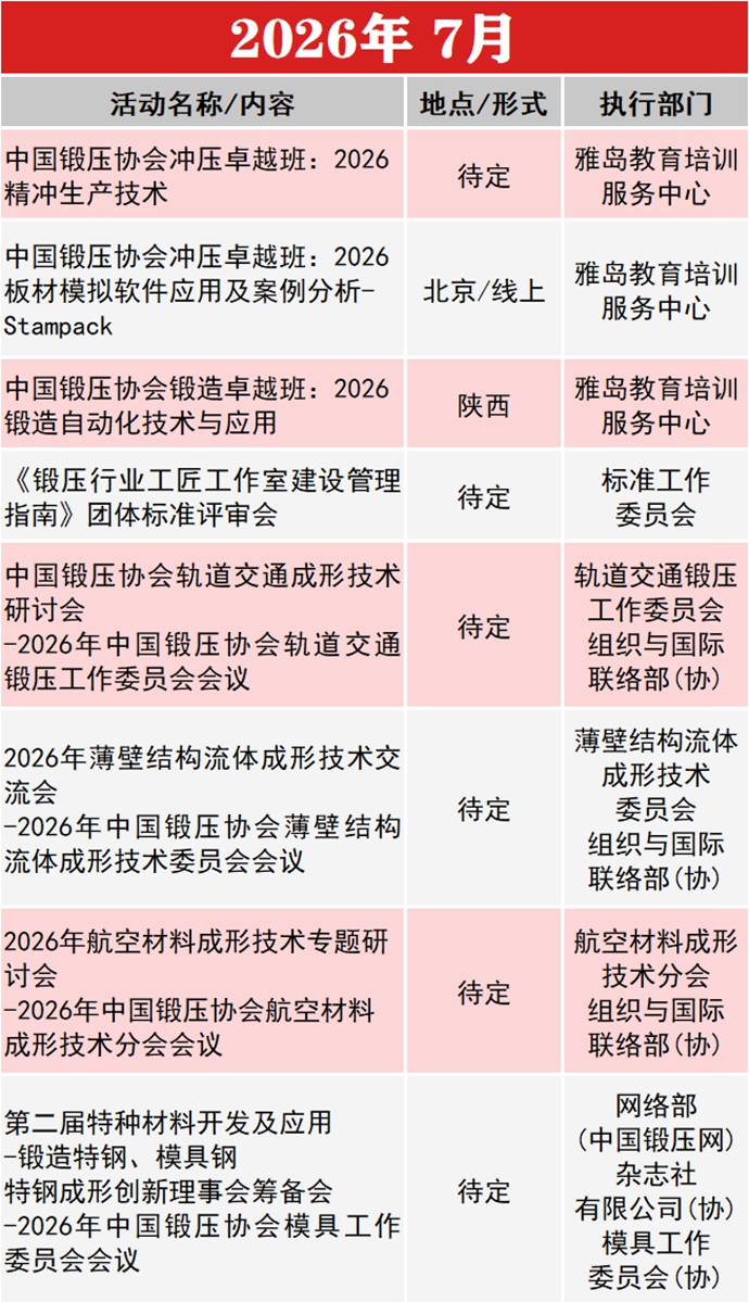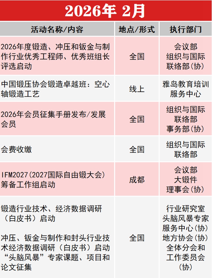 活动计划将根据行业工作需要进行时间、地点和内容的调整,也会有新的活动出台,请关注 官网www.chinaforge.org.cn 和 会议中心www.sinoforging.com信息。