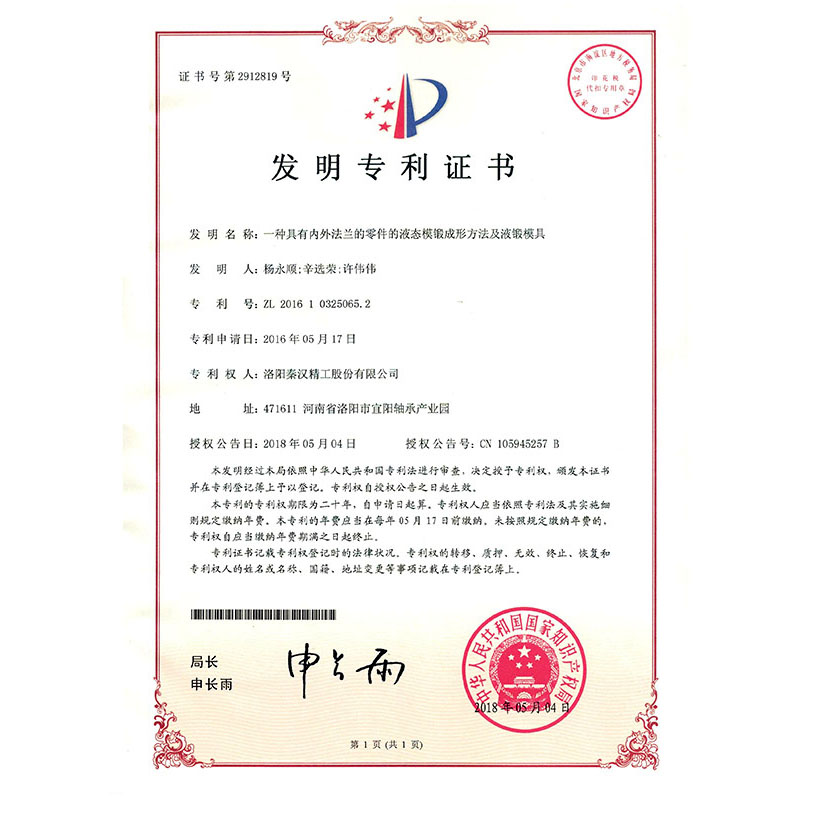 一种具有内外法兰的零件的液态模锻成形方法及液锻模具专利证书