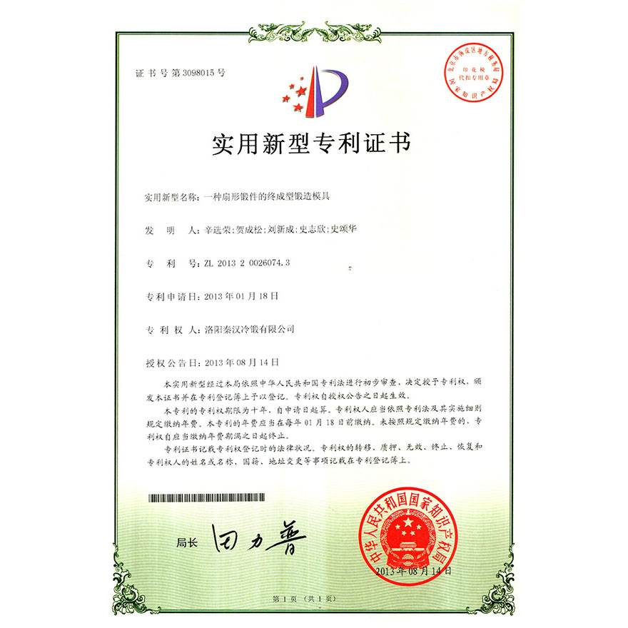高强度裙座式自锁六方螺帽的冷锻模具专利证书