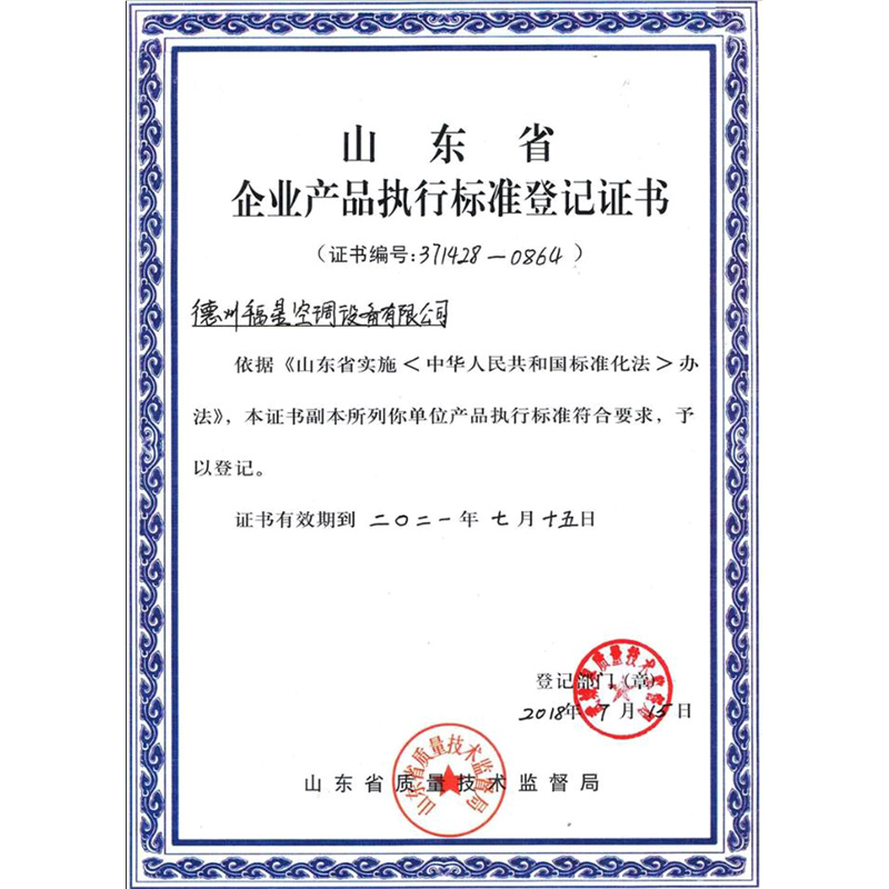 山东省企业产品执行标准等级证书