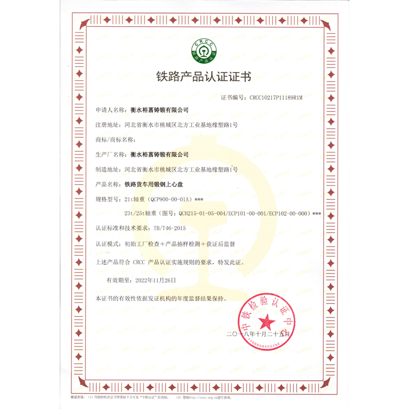 铁路火车用锻钢上心盘-铁路产品认证证书
