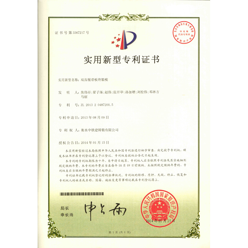 双齿履带板终锻模实用新型专利证书
