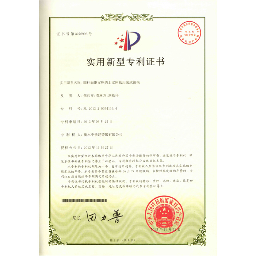 圆柱面钢支座的上支座板用闭式锻模实用新型专利证书