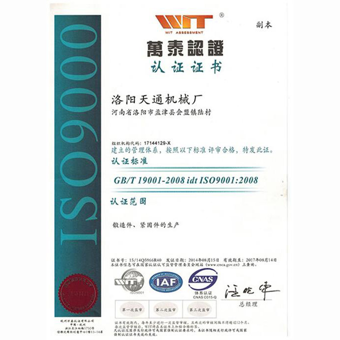 天通机械厂9001认证书-中文