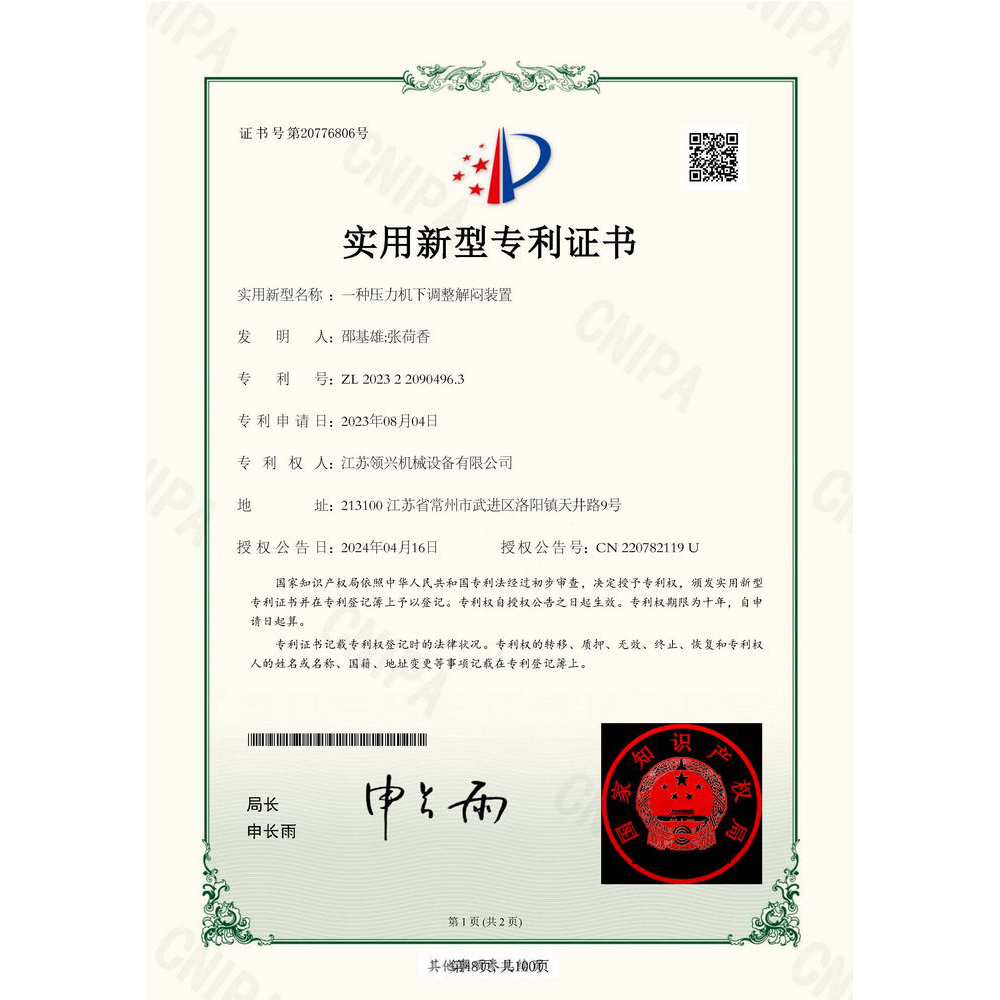 《一种压力机下调整解闷装置》专利证书