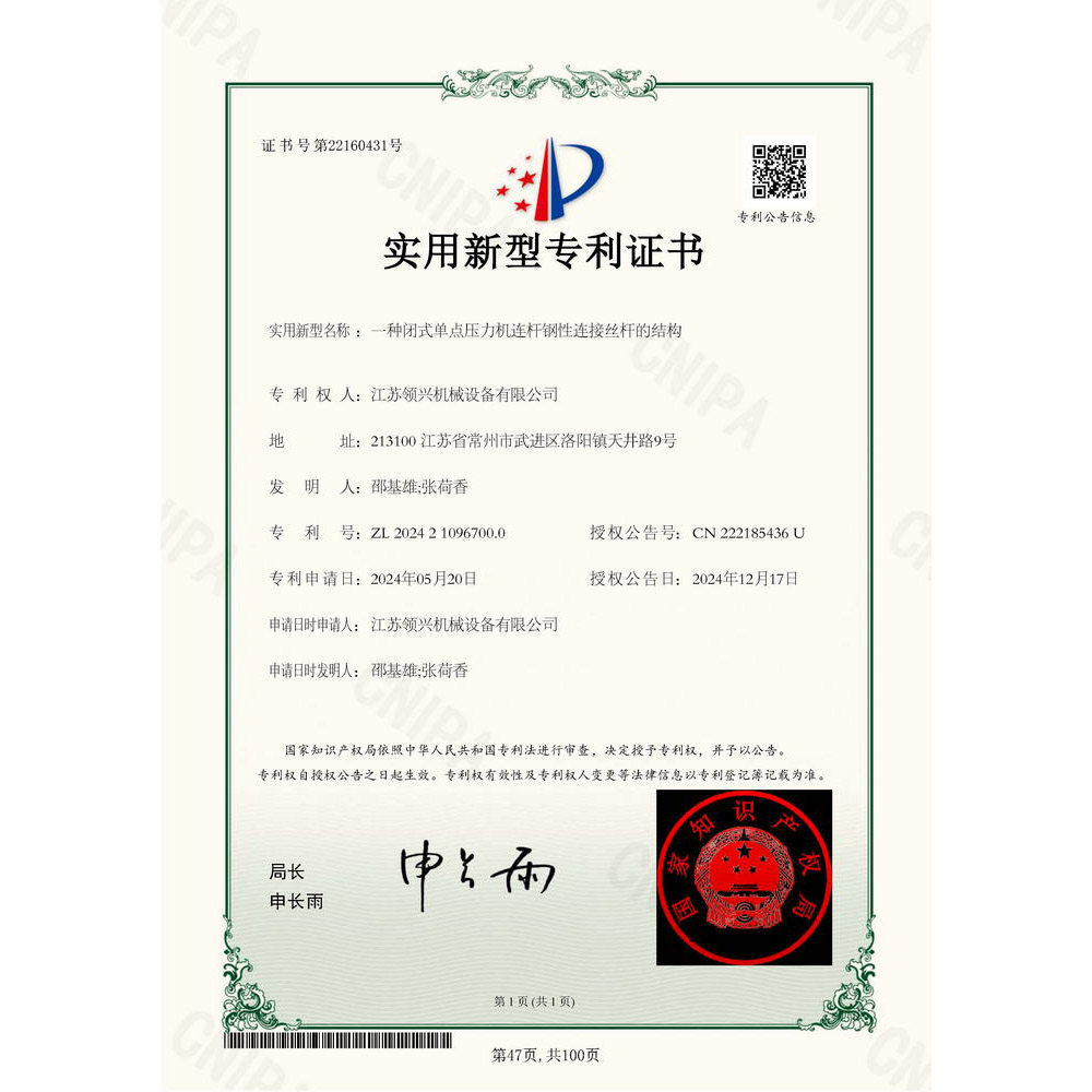 《一种闭式单点压力机连杆钢性连接丝杆的结构》专利证书