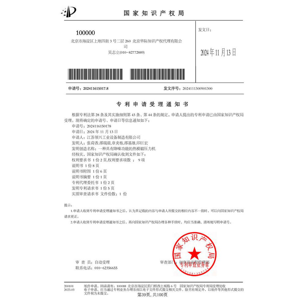 《一种具有降噪功能的热模锻压力机》专利受理