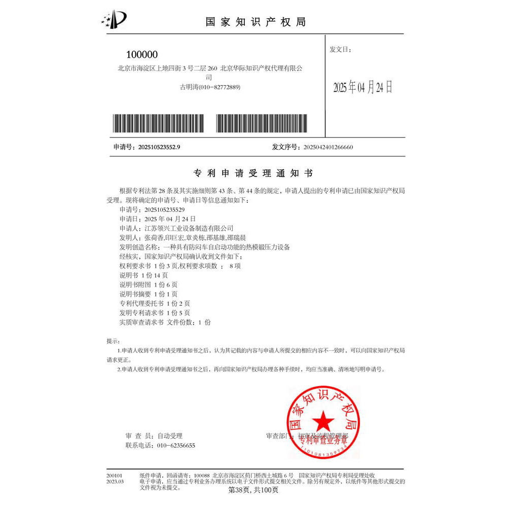 《一种具有防闷车自启动功能的热模锻压力设备》专利受理