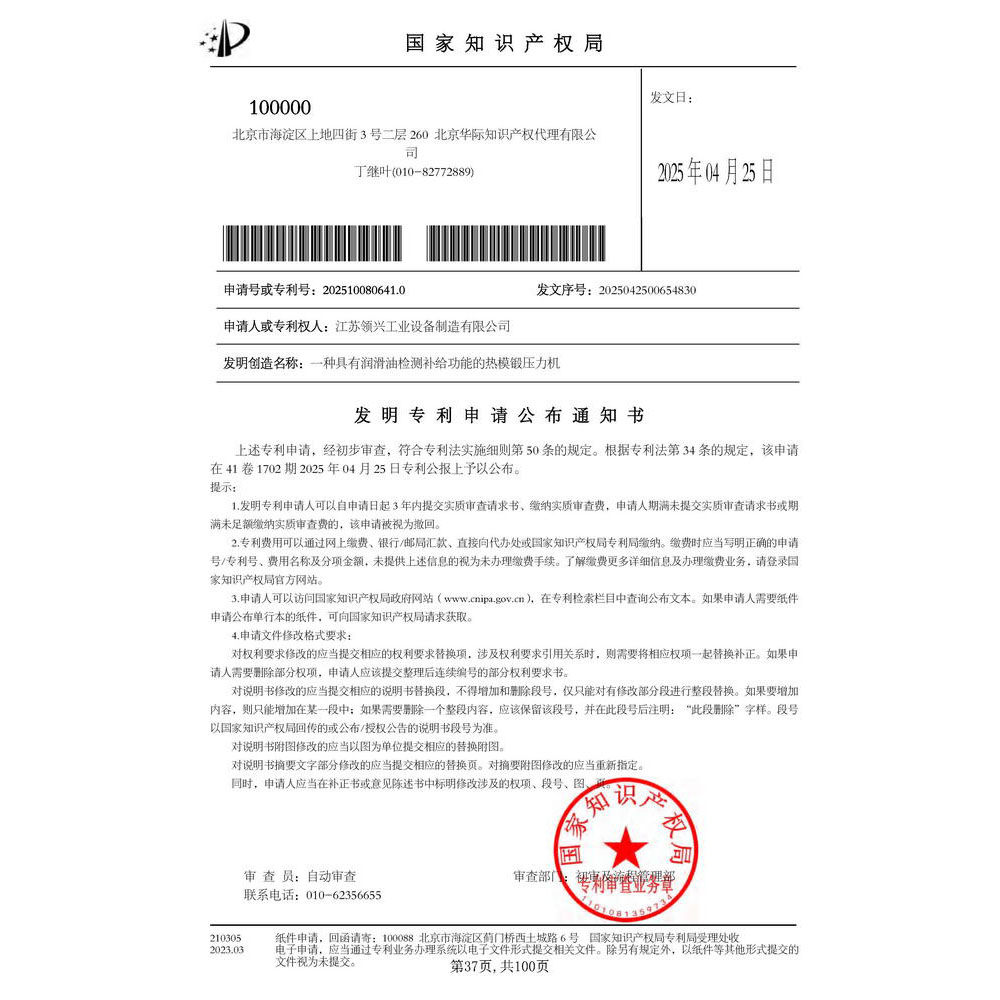 《一种具有润滑油检测补给功能的热模锻压力机》专利受理
