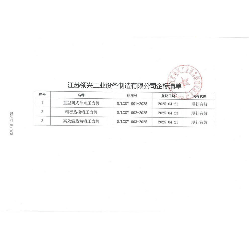 江苏领兴企业标准清单