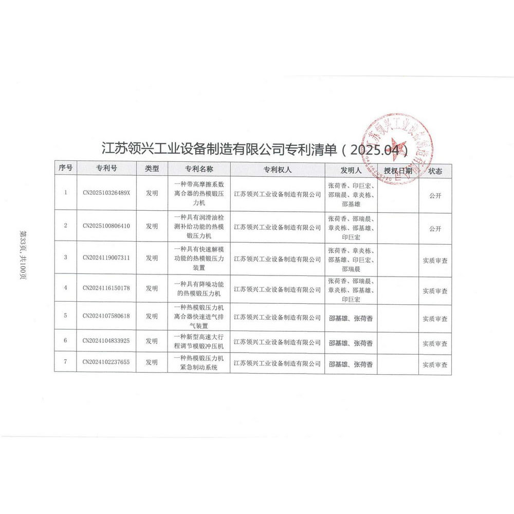 《一种带高摩擦系数离合器的热模锻压力机》专利公布