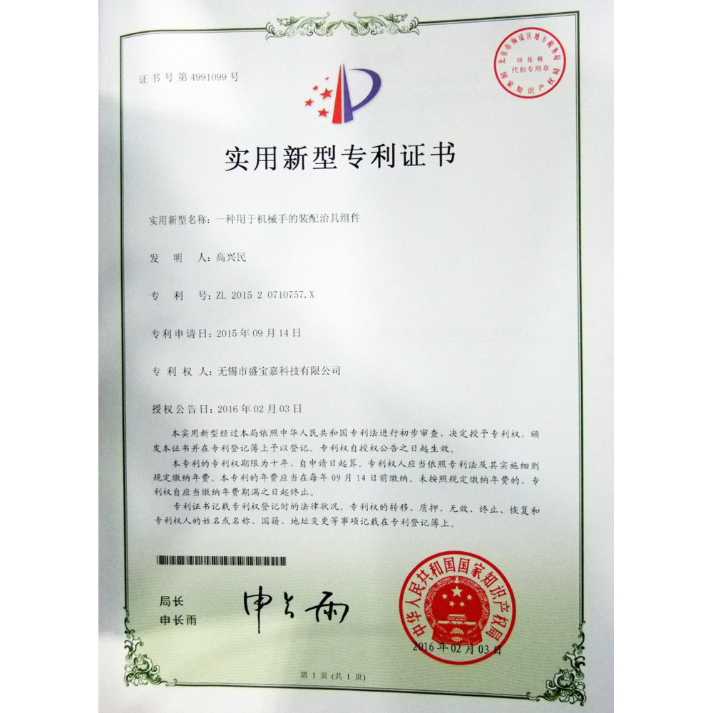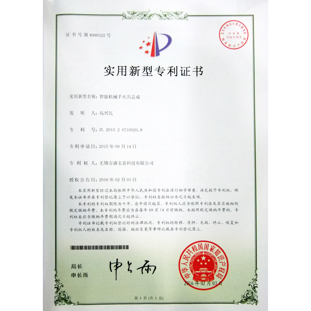 实用新型专利证书(智能机械手夹具总成)