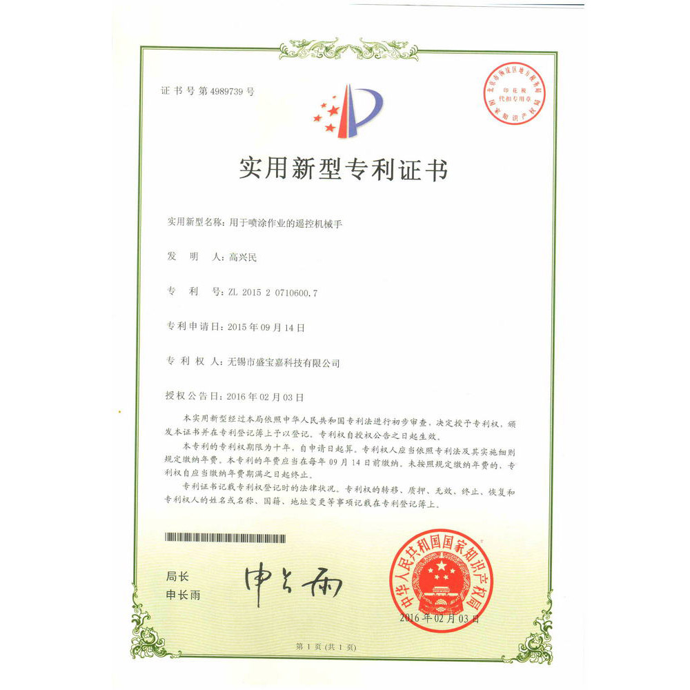 实用新型专利证书(用于喷涂作业的遥控机械手)