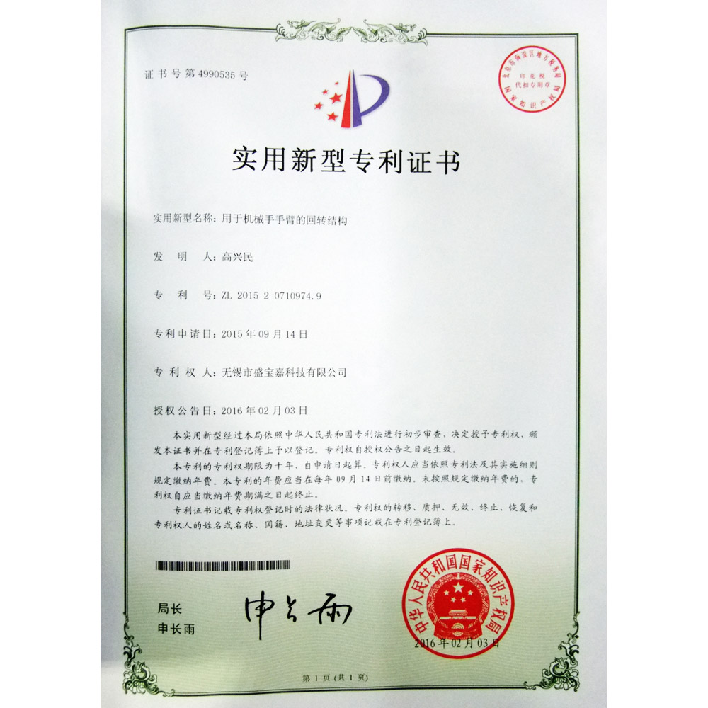 实用新型专利证书(用于机械手手臂的回转结构)