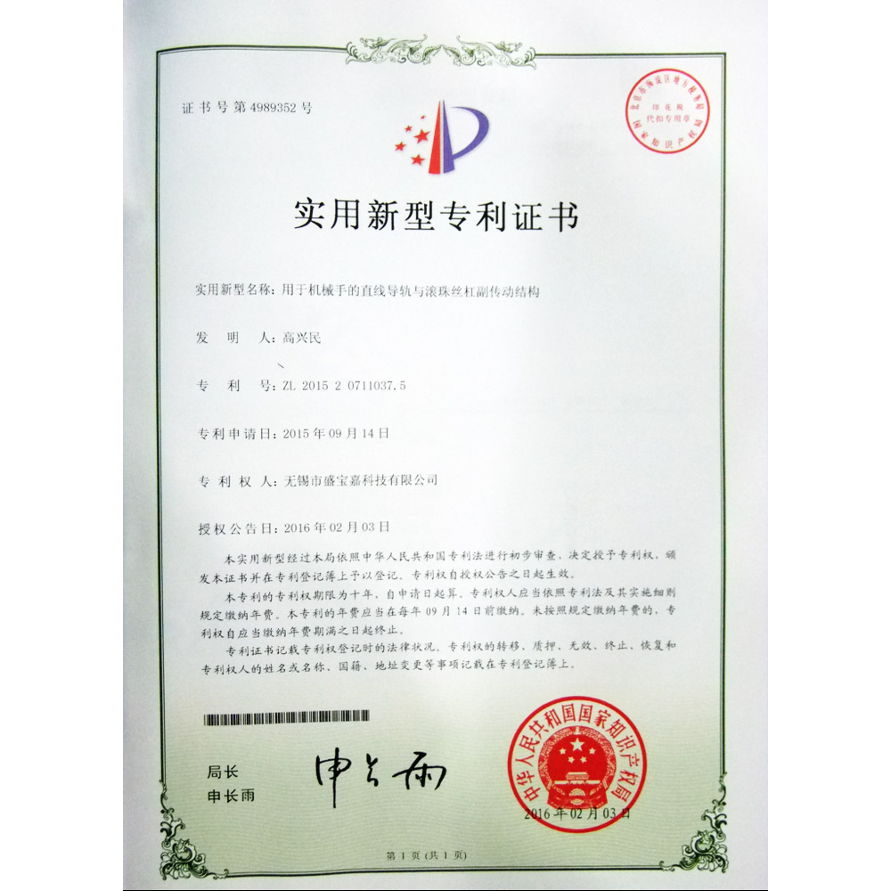 实用新型专利证书(用于机械手的直线导轨与滚珠丝杆副传动结构)