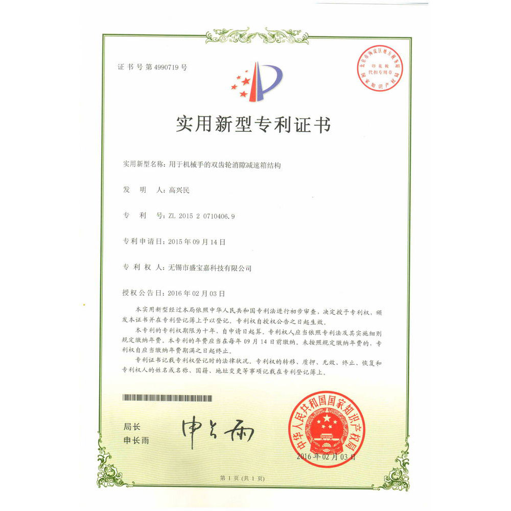 实用新型专利证书(用于机械手的双齿轮消隙减速箱结构)