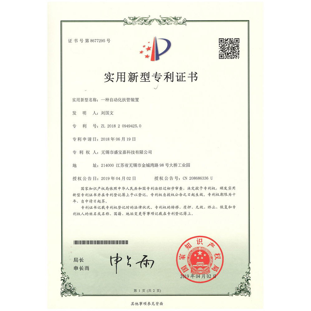 实用新型专利证书(一种自动化扶管装置)