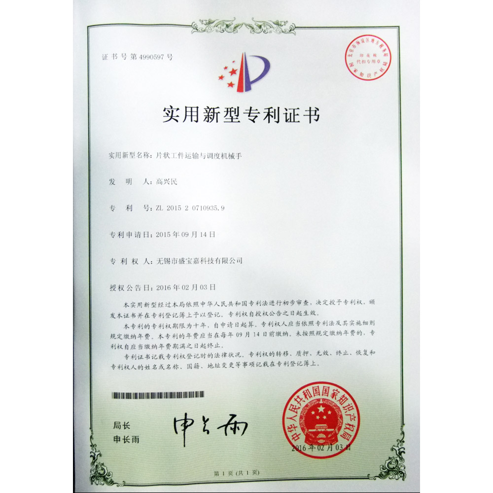 实用新型专利证书(片状工件运输与调度机械手)