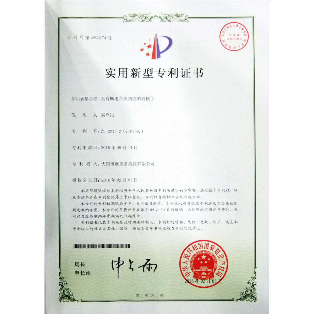 实用新型专利证书(具有断电自锁功能的机械手)
