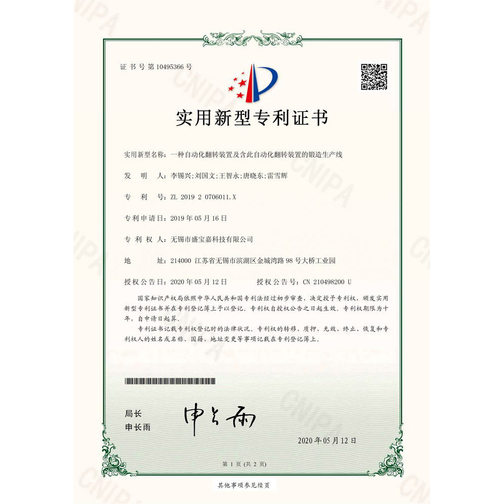 实用新型专利证书-(一种自动化翻转装置及含有此自动化翻转装置的锻造生产线)