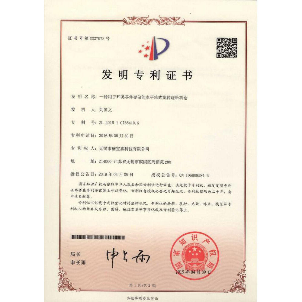 实用新型专利证书(一种自动化旋转料仓)