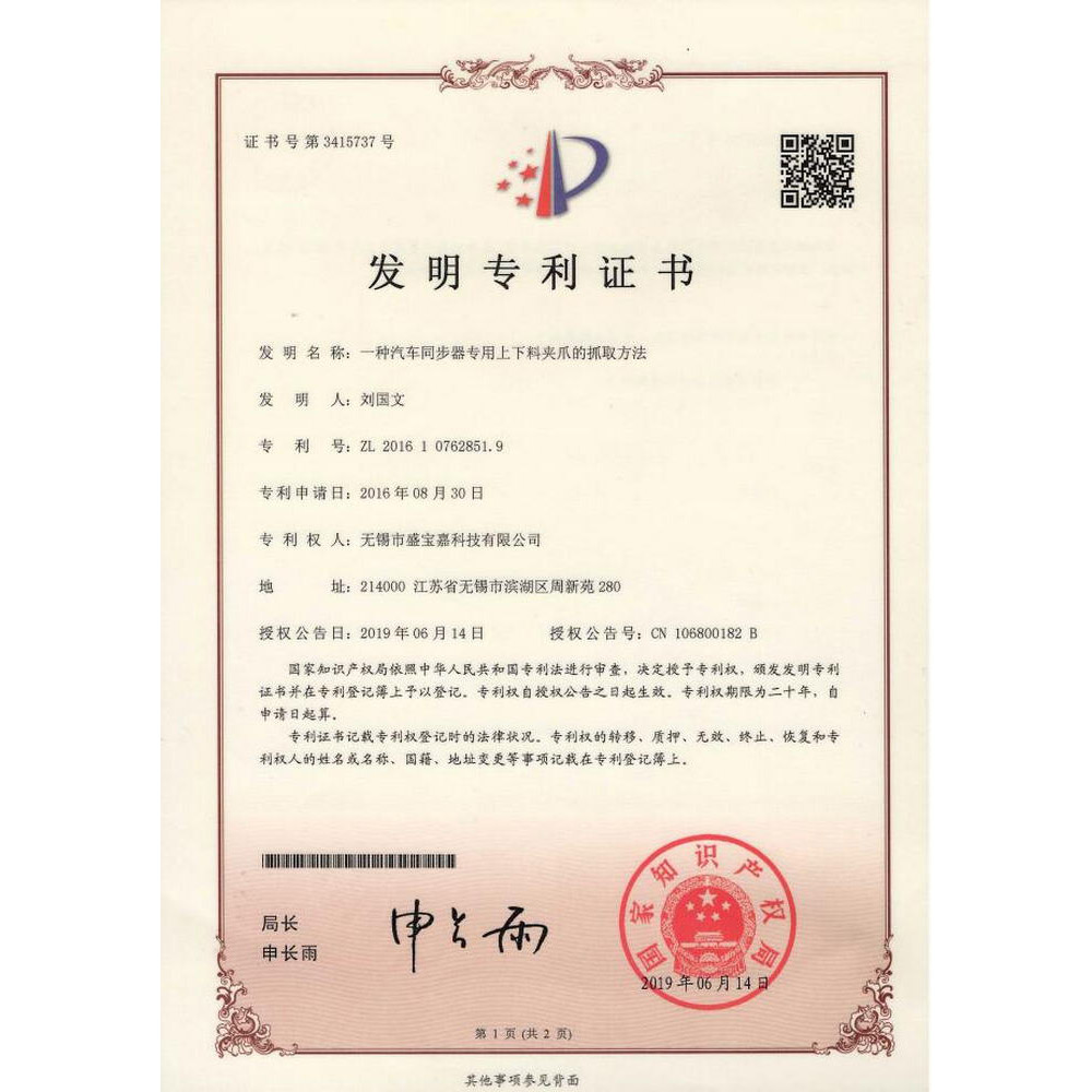 发明专利(一种汽车同步器专用上下料夹爪的抓取方法)
